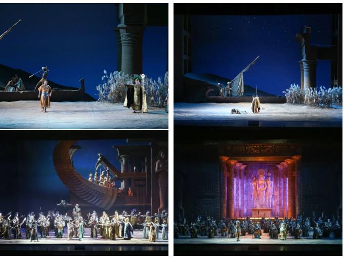 舞美设计由曾获奥斯卡金像奖的大师埃兹欧・弗里杰利奥倾力打造,四大场景震撼人心:巍峨神庙与10吨巨船尽显古埃及庄严,《凯旋进行曲》中的盛大游行气势恢宏,月光下的尼罗河旖旎梦幻,墓穴审判的悲剧场景极具压迫感。多媒体投影与灯光虚实结合,让观众身临其境,感受每一幕的视觉奇观。